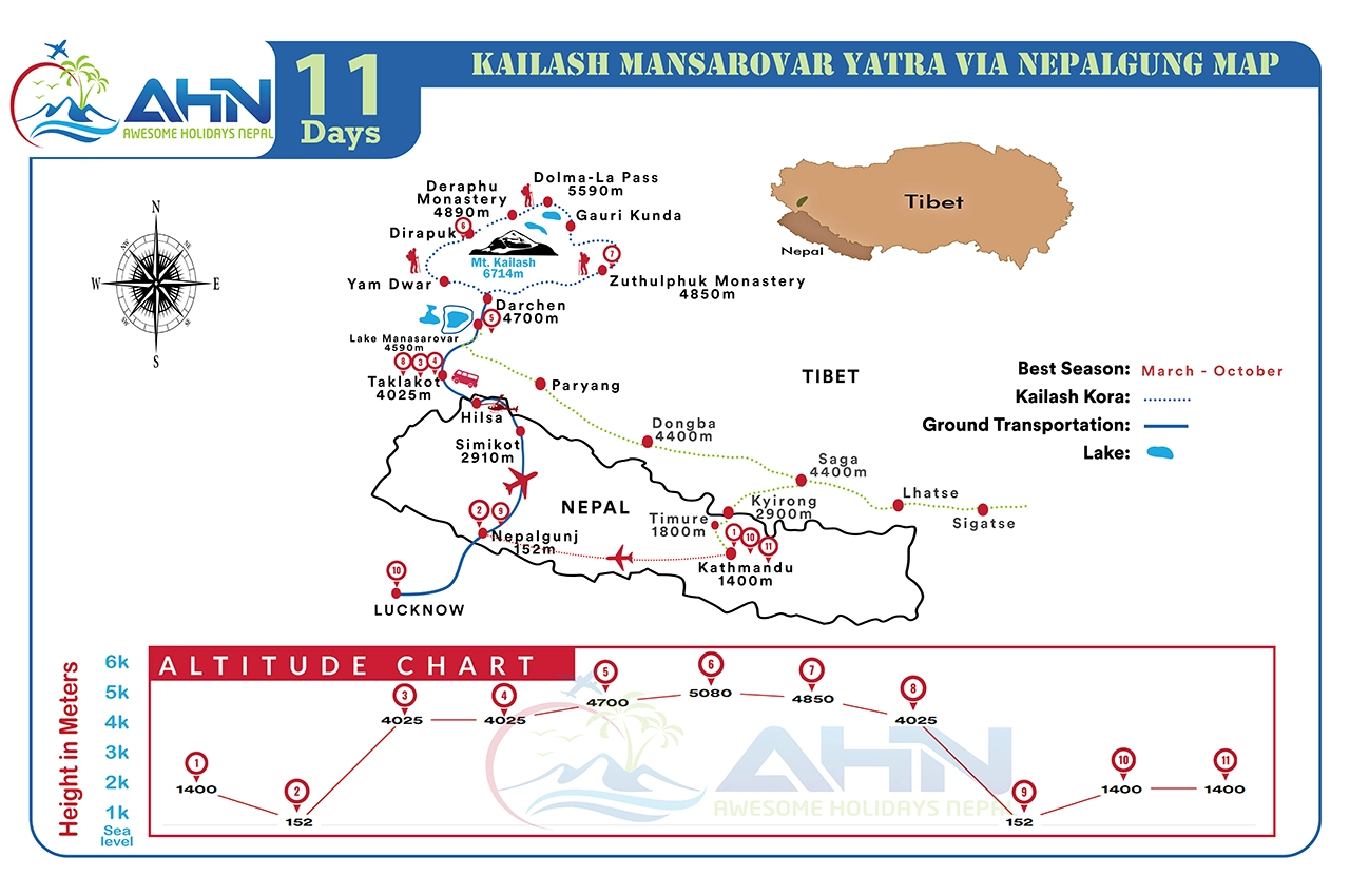 Helicopter Route (via Simikot, Hilsa, and Taklakot): Shorter and faster option, popular with those who have less time.